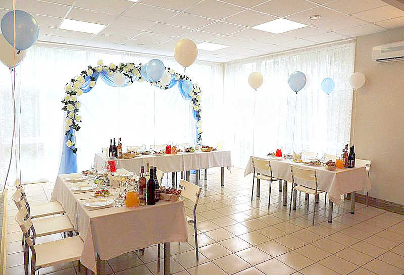 Провести мероприятие на выгодных условиях возможно в банкетном зале, вмещающим до 40 гостей. Если свадьба отмечается в нашем отеле, то молодожёны в подарок получают оборудованный для них номер.
