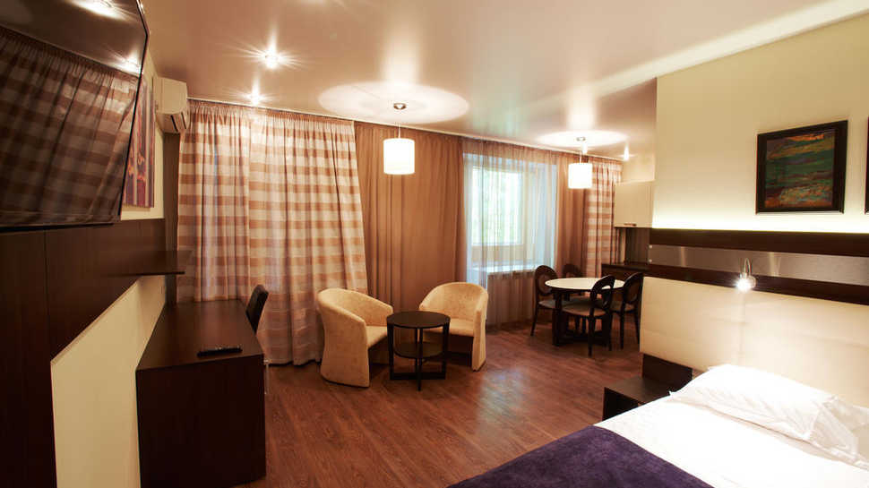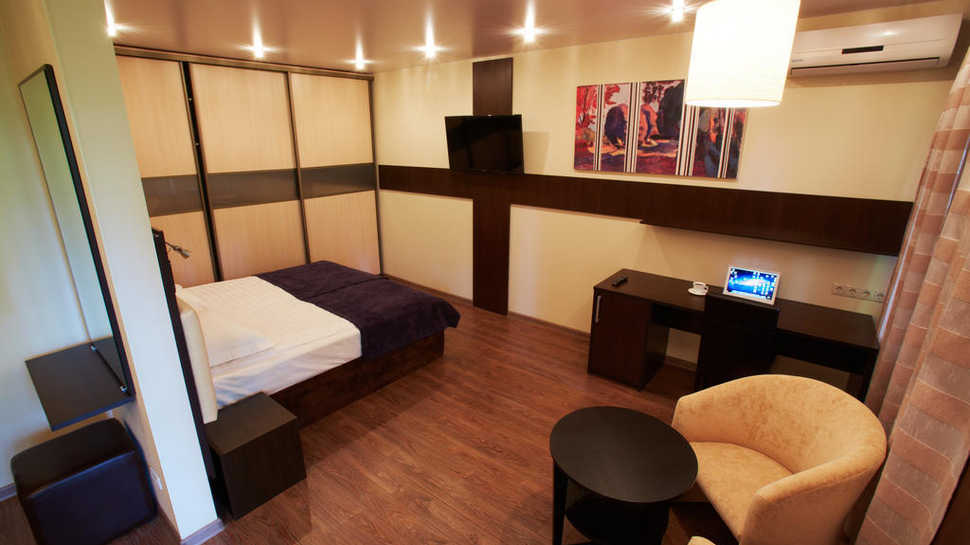 Одноместные и двухместные стандарты укомплектованы большой удобной двуспальной кроватью с ортопедическим матрасом и белоснежным комплектом постельного белья, кондиционером, холодильником, феном, утюгом, микроволновой печью, посудомоечной и стиральной машинами, телевизором, Wi-Fi, душевой кабиной. Также в номерах имеются чайная и столовая посуда, чай, кофе, сахар, питьевая вода, махровое полотенце, тапочки.