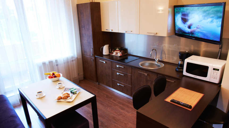 Студия, помимо вышеперечисленных предметов, имеет одну двуспальную и две полуторные кровати и выделенную обеденную зону со встроенным кухонным уголком с плитой, микроволновой печью, холодильником, электрочайником, кофеваркой и полным набором кухонной посуды.