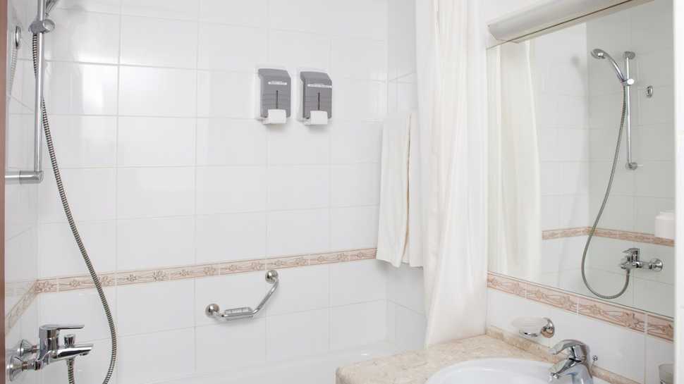 В номере сейф, эл.чайник, холодильник (платный — содержимое)…В душевой весь комплект для душа…единственное…надо полочку в кабине подкорректировать — пакеты от шампуня пролетают и падают в воду…(раз пять ловил)…