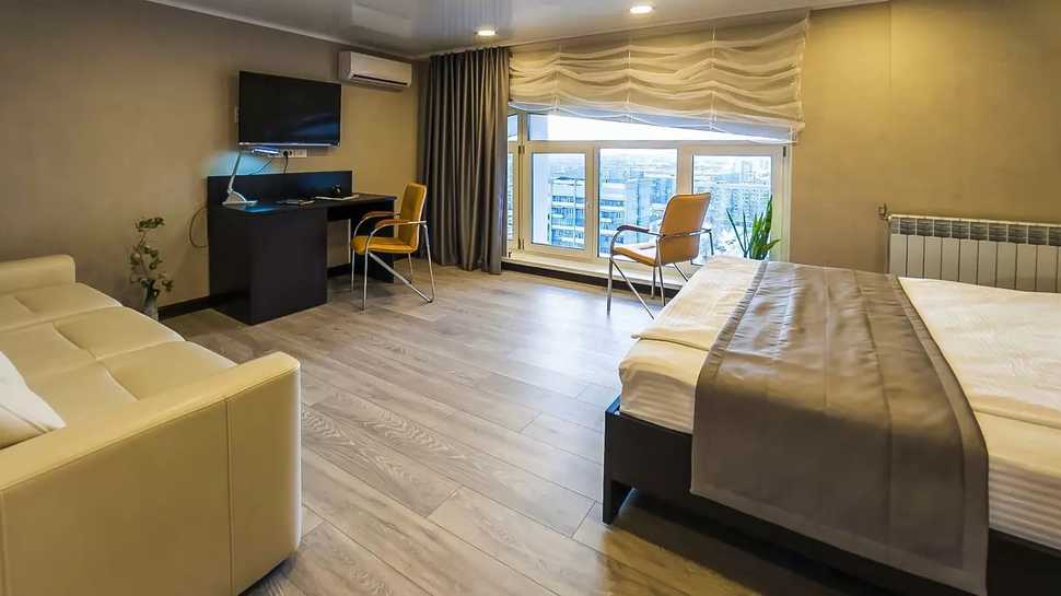 В верхнем уровне — самом высоком жилом месте Магнитогорска находится номер категории «Студио», создающая своим гостям настроение полного уединения, умиротворения и покоя на высоте птичьего полета…