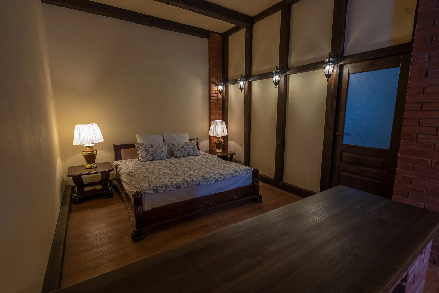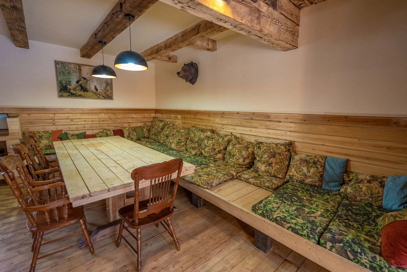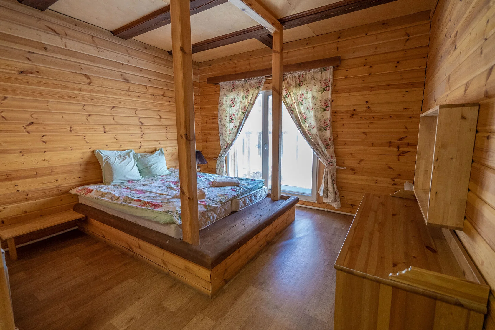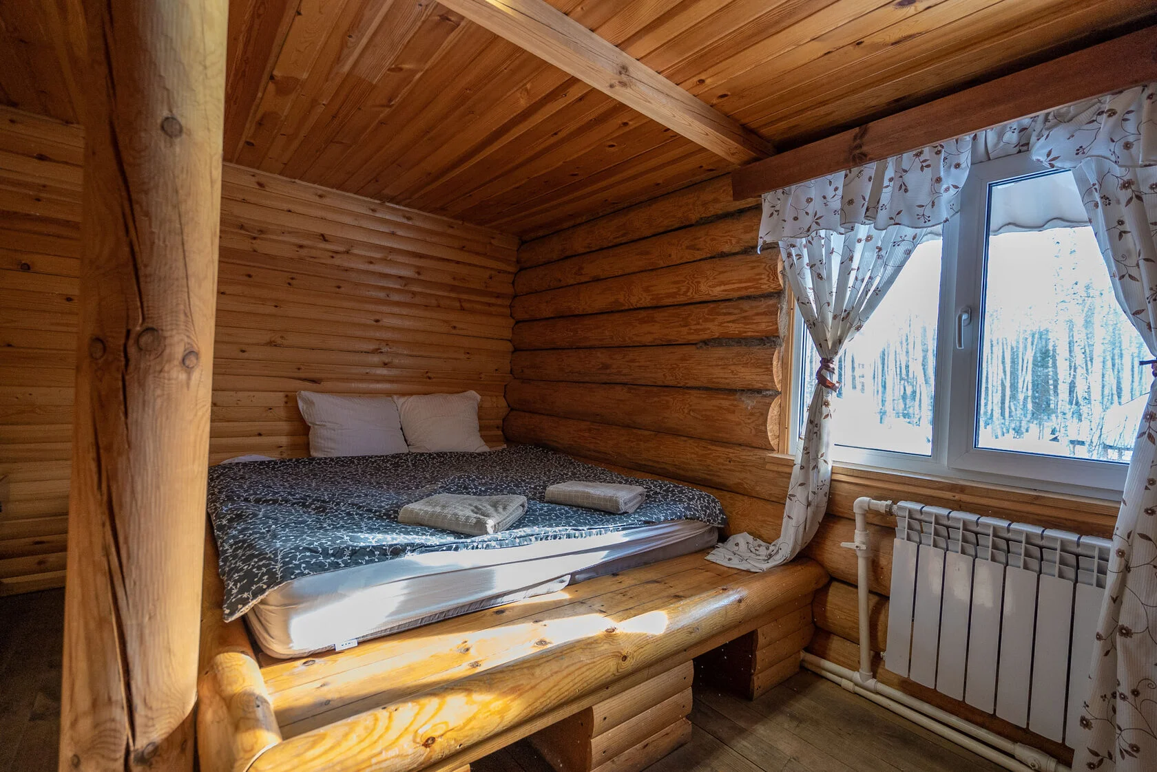 Несмотря на большое количество домиков, гостиничный комплекс выполнен в единой древесной стилистике. Каждый номер, вне зависимости от его класса (эконом или люкс) выглядит шикарно и имеет все необходимые удобства для проживания, включая санузел и душ. Гостиничный комплекс нацелен на прием целых семей и больших компаний. Здесь не только можно арендовать двух и четырехместные номера, но и целые коттеджи и домики. Они способны вместить в себя до 12 человек. Прием гостей осуществляется круглый год.