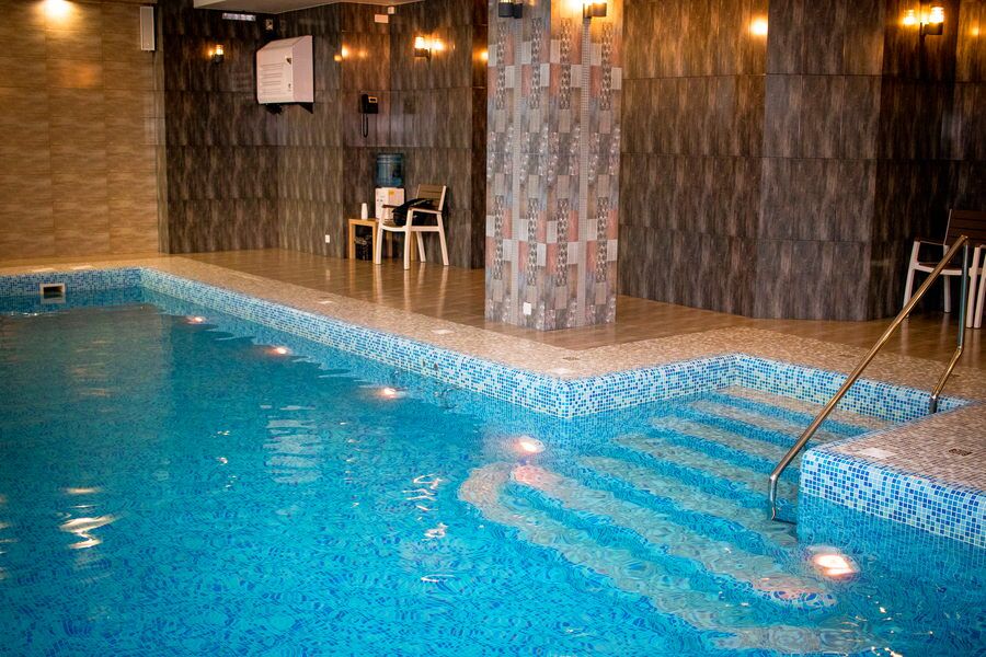 Аква-этаж – жемчужина комплекса, предлагает : 16-ти метровый подогреваемый взрослый бассейн с различными вариантами гидромассажей и противотоком, детский бассейн, тренажерный зал, финская сауна, игровая комната для маленьких путешественников.